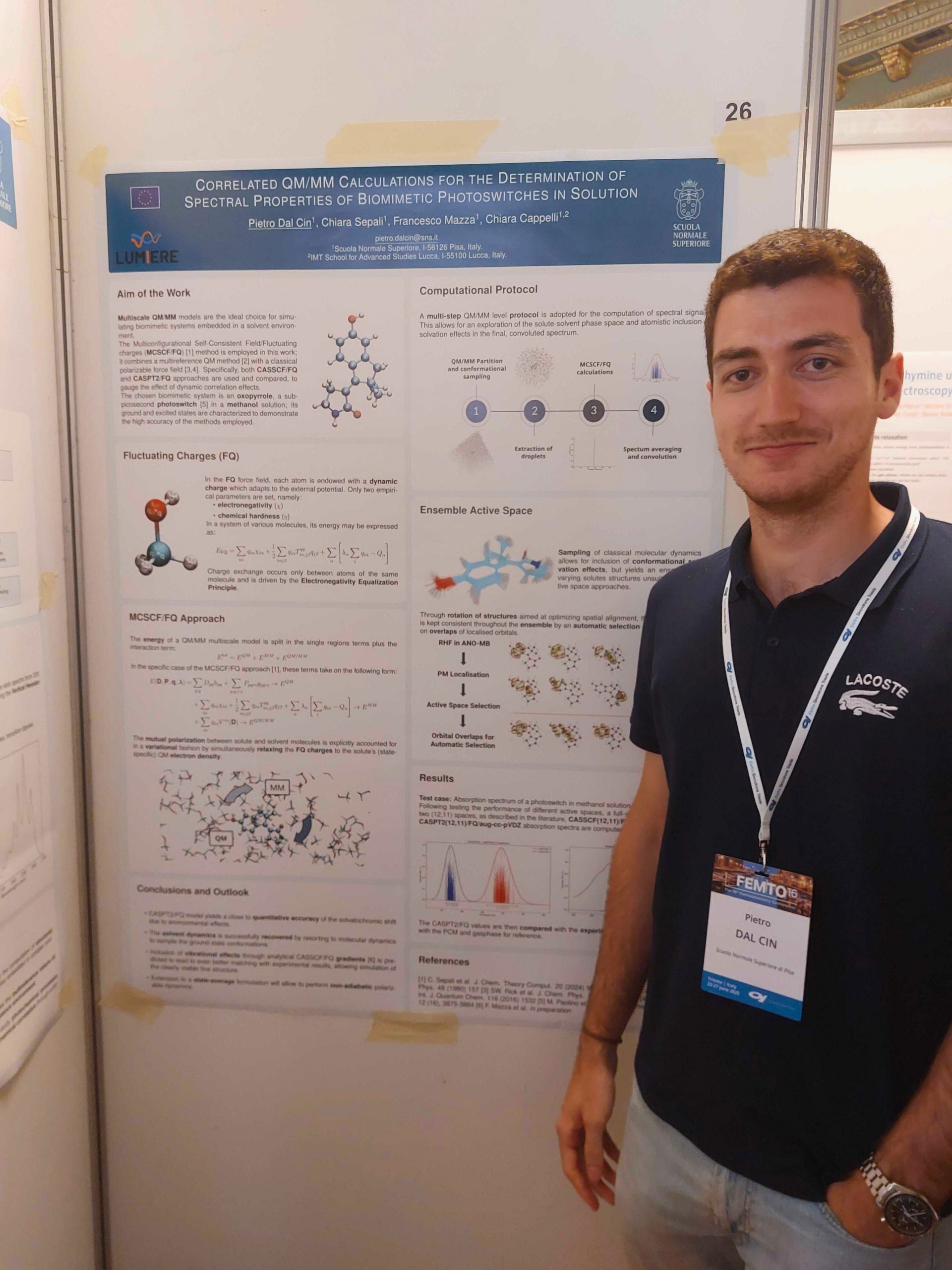 During the 16th Femtochemistry Conference in Trieste, Italy, from June 22 to 27, 2025, LUMIERE doctoral student Pietro Dal Cin presented a poster entitled “Correlated QM/MM Calculations for the Determination of Spectral Properties of Biomimetic Photoswitches in Solution.”