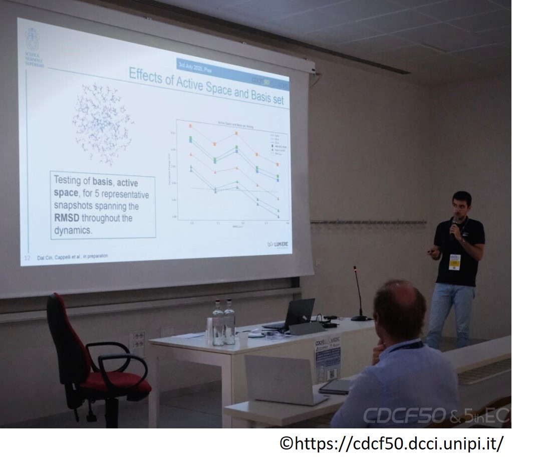 On July 3, 2025, LUMIERE doctoral student Pietro Dal Cin gave a presentation entitled “Correlated qm/mm calculations for the determination of spectral properties of biomimetic photoswitches in solution” at the joint 50th Congress of the Physical Chemistry Division of the Società Chimica Italiana and the 5th European Conference on Physical Chemistry in Pisa, Italy.